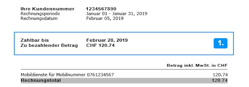 1) Hier findest du den Gesamtbetrag deiner Rechnung sowie die Zahlungsfrist.