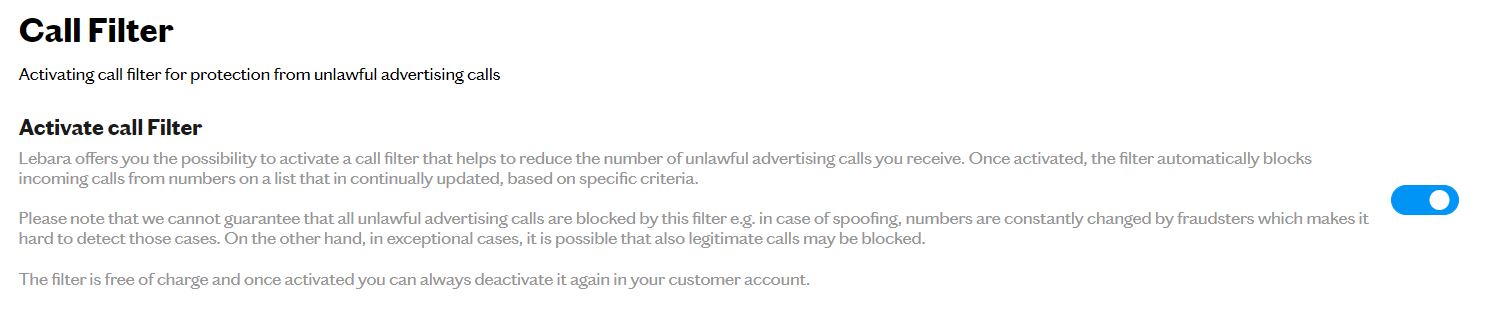 Unerwünschte Anrufe können direkt in my Lebara blockiert werden, indem der Call Filter in den Einstellungen aktiviert wird.