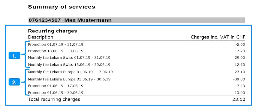 The monthly charge for the new Lebara Swiss plan that came into effect on 18 June 2019 will be billed to the end of the month (CHF 12.60). The customer will also be billed the monthly charge for July for the new Lebara Swiss plan (CHF 29.00).