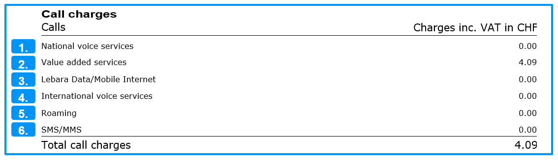 All incoming and outgoing phone calls, SMS and data connections made outside Switzerland (roaming) and not included in your mobile plan are shown here.
