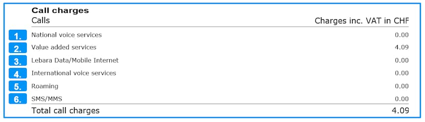 International phone calls (from Switzerland to other countries) that are not included in your mobile plan are shown here.