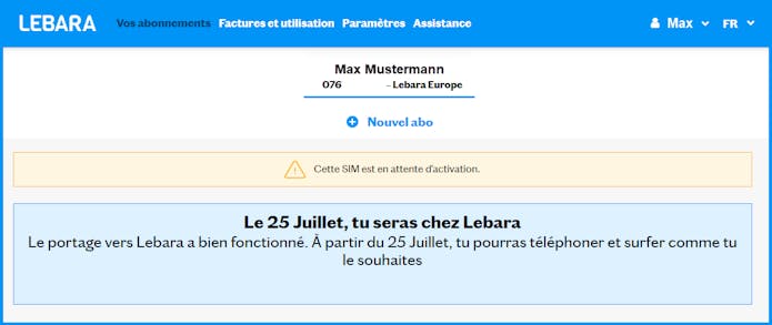 Dès que la reprise de ton numéro est confirmée, tu recevras une date d’activation. Nous activerons ton abonnement chez Lebara à cette date. Tu recevras plusieurs rappels par SMS de notre part afin qu’à la date d’activation, tu sois prêt à placer ta SIM Lebara dans ton téléphone.