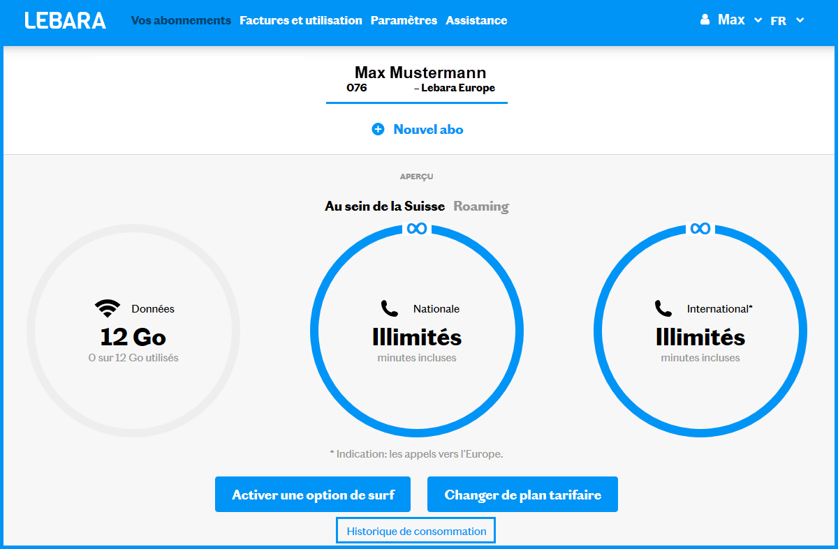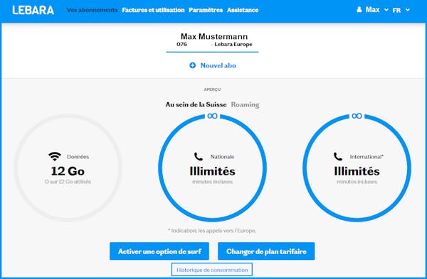 Tu peux consulter simplement et à tout moment ce qui est inclus dans ton abonnement en ligne dans my Lebara, sous «Vos abonnements». Si tu as un crédit limité, cette fonction te permet également de savoir combien tu en as déjà utilisé. Tu trouveras des informations détaillées sur ta consommations en cliquant sur «Historique de consommation».