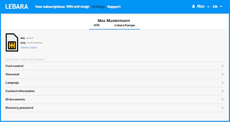 You can adjust settings for cost control and voice messages under "Settings" in my Lebara.