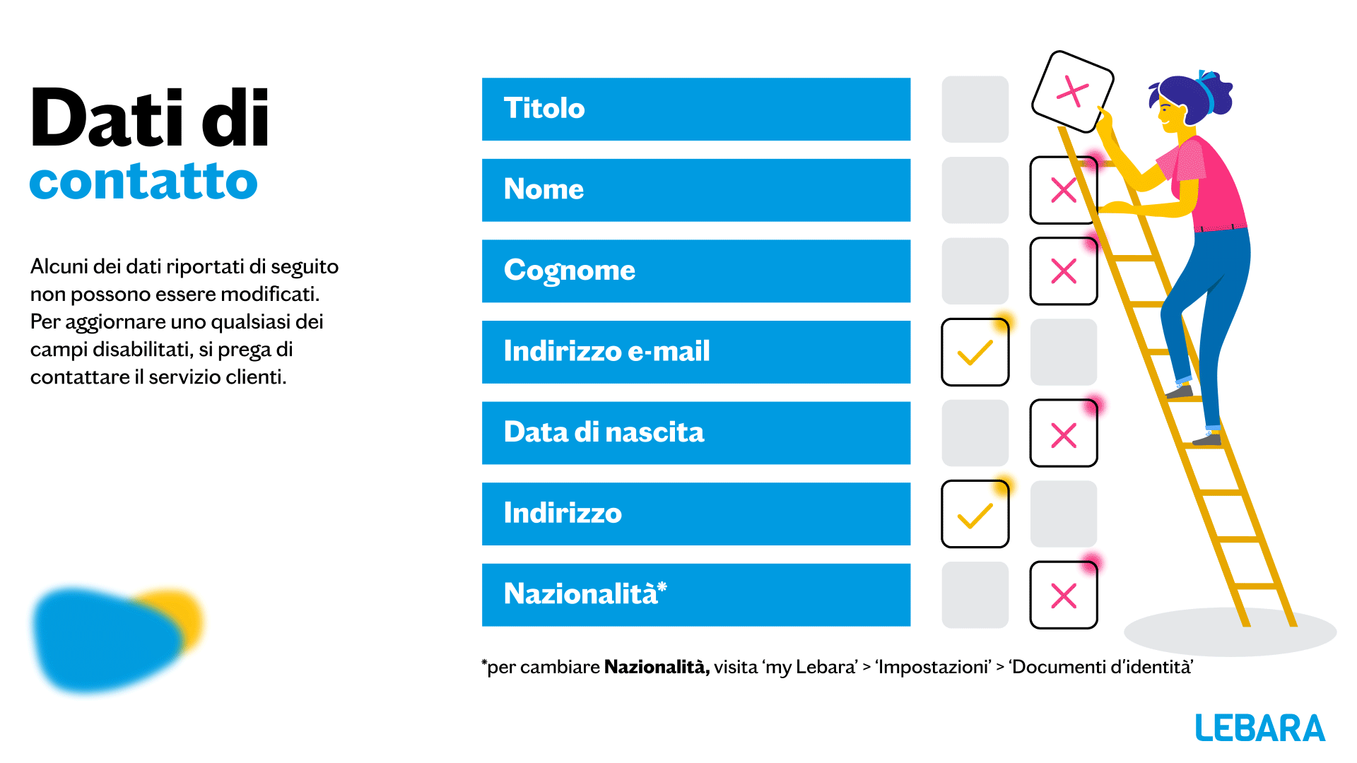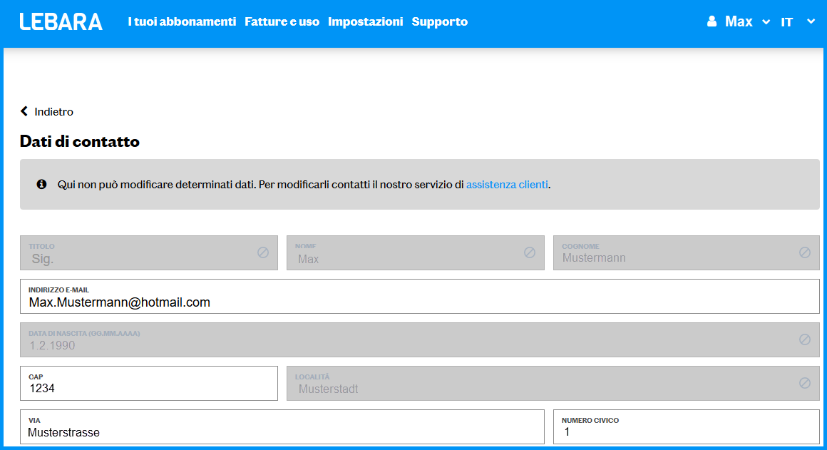 Puoi modificare il tuo indirizzo e-mail in tutta semplicità in my Lebara alla voce «Dati di contatto», insieme al tuo indirizzo e alla lingua desiderata per le e-mail e la corrispondenza.