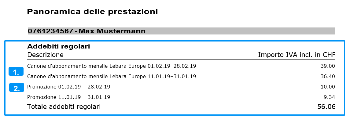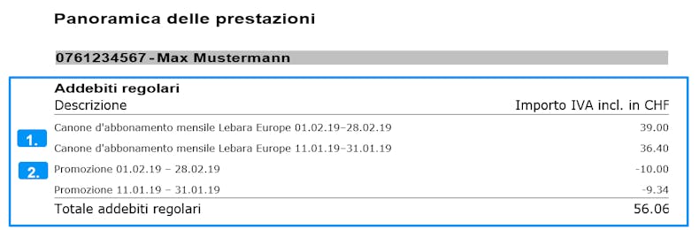 1) Sotto questa voce trova i canoni mensili di base del suo abbonamento Lebara. Sulla sua prima fattura trova un canone mensile cumulativo per i primi due mesi (primo mese pro rata, secondo mese intero), nelle fatture dei mesi successivi solo il canone mensile del mese seguente. Se alla stipula del contratto hai acquistato un cellulare, per 24 mesi il canone di base dell'abbonamento di telefonia mobile comprende il rispettivo supplemento.